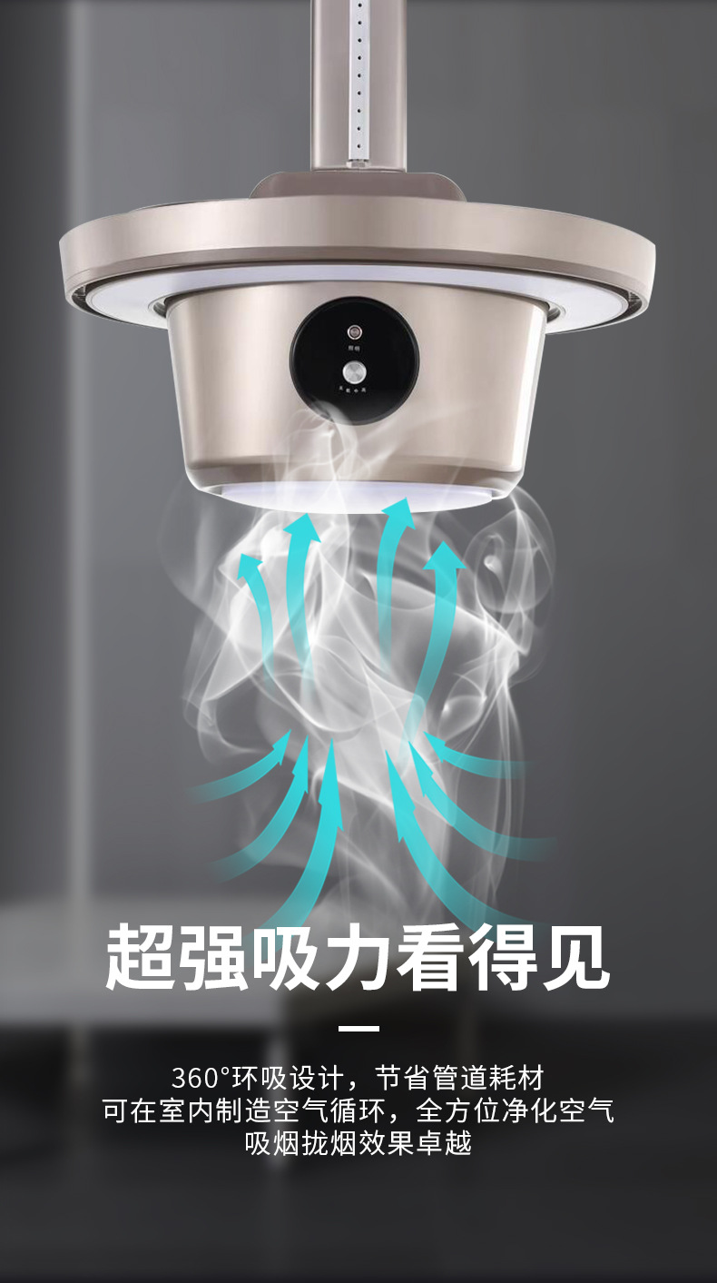 吸力大,聲音小,重量輕。360°環(huán)吸設(shè)計(jì),節(jié)省管道耗材。可在室內(nèi)制造空氣循環(huán),全方位凈化空氣吸煙攏煙效果卓越。