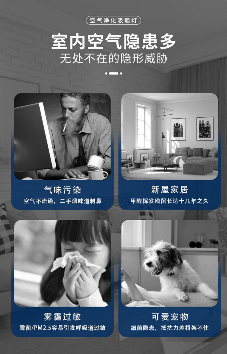 棋牌室、會客廳、包間、KTV、會所、候車廳等除煙除塵凈化燈,集吸煙、照明、裝飾三位一體