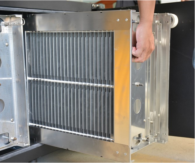 清洗油煙凈化器之前我們首先要準備以下防護工具; 清洗劑一斤,防護手套,高壓水槍,體積大于電場的水箱,以及護目鏡等小工具 第二步(打開設備柜門) 我們用鑰匙打開設備的電箱門,然后在打開設備的電場門(擰下左側的二顆螺絲) 第三步(設備放電) 當我們打開電場門之后,會看到二個鋁制的電場并排放置,這時我們先使用螺絲刀觸碰電場的高壓區和低壓區(四角都需觸碰)將殘留的電流釋放干凈 第四步(取出電場) 進行完放電工作后,我們將二個電場微微抬起后并用力抽拉出來即可(注意電場需要輕拿輕放,切勿將電場弄變形) 第五步(調制清洗劑) 我們將準備好的容器倒滿60度左右的溫水(清洗劑和水的比例1:25),將一斤清洗劑全部倒入并攪拌均勻。 第六步(清洗電場) 將取出來的電場平著放入容器中,浸泡5分鐘后我們將電場翻一個面繼續浸泡5分鐘(翻面的過程中在水中輕搖電場,晃動造成油污脫離)每個電場都是一樣的步驟 第七步(沖洗電場) 將浸泡完畢的電場取出來,用我們事先準備好的高壓水槍對電場的內部進行沖洗。如沒有高壓水槍也可以使用水龍頭管沖洗,一定要將電場內部的油污清洗干凈。(不可私自拆卸電場組件,不可用清潔球或鋼制物品清洗油污) 第八步(晾干電場) 將清洗干凈的電場放置于通風的地方,晾曬控干水分并檢查電場內部是否有異物或者是較大的變形。確保電場晾干后,無異物的情況下放回設備中。 第九步(清洗完步) 保證電場晾干后放回機箱,然后擦洗電箱陶瓷絕緣子直至清潔干凈為止,然后關閉機箱門即可